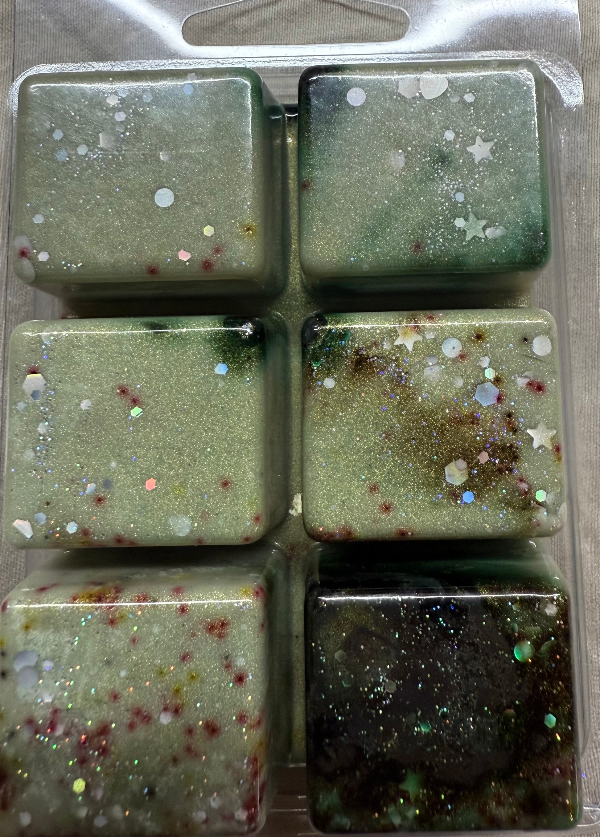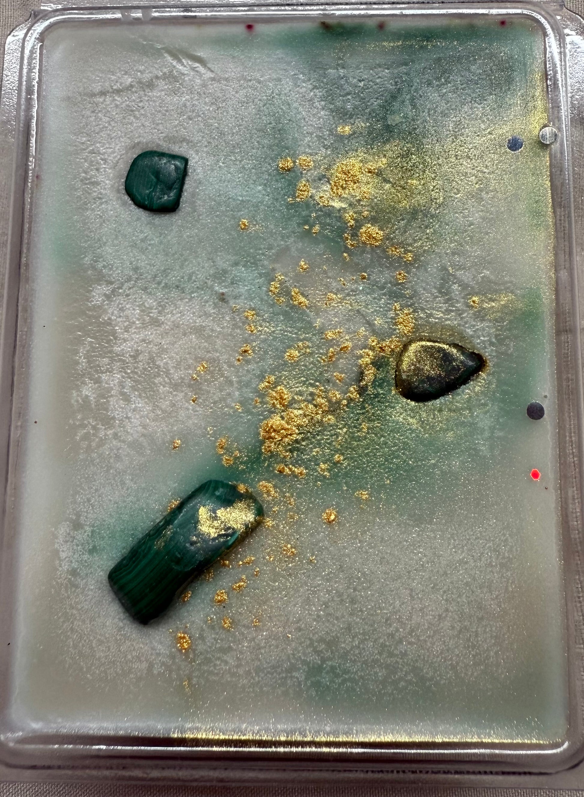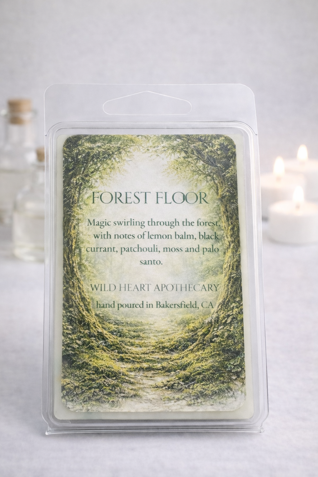 Forest Floor is infused with a lemon balm, black currant, patchouli and musk fragrance oil, mica powder, glitter, candle dye and malachite chips.