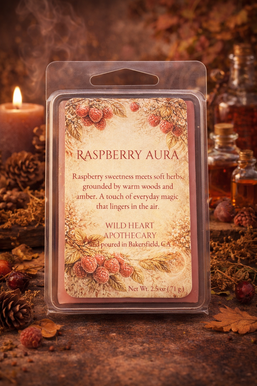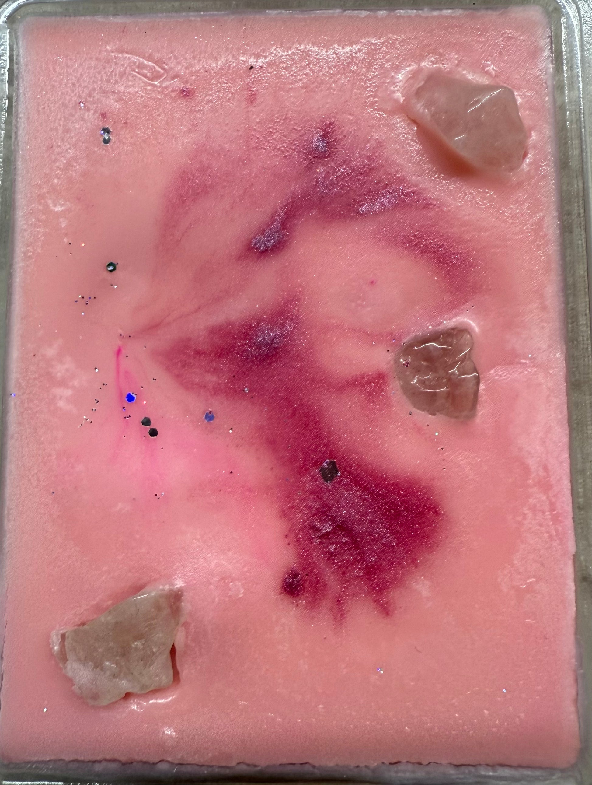 Raspberry Aura is infused with a sweet raspberry and herbal fragrance oil. mica powder, glitter, candle dye and rose quartz chips.