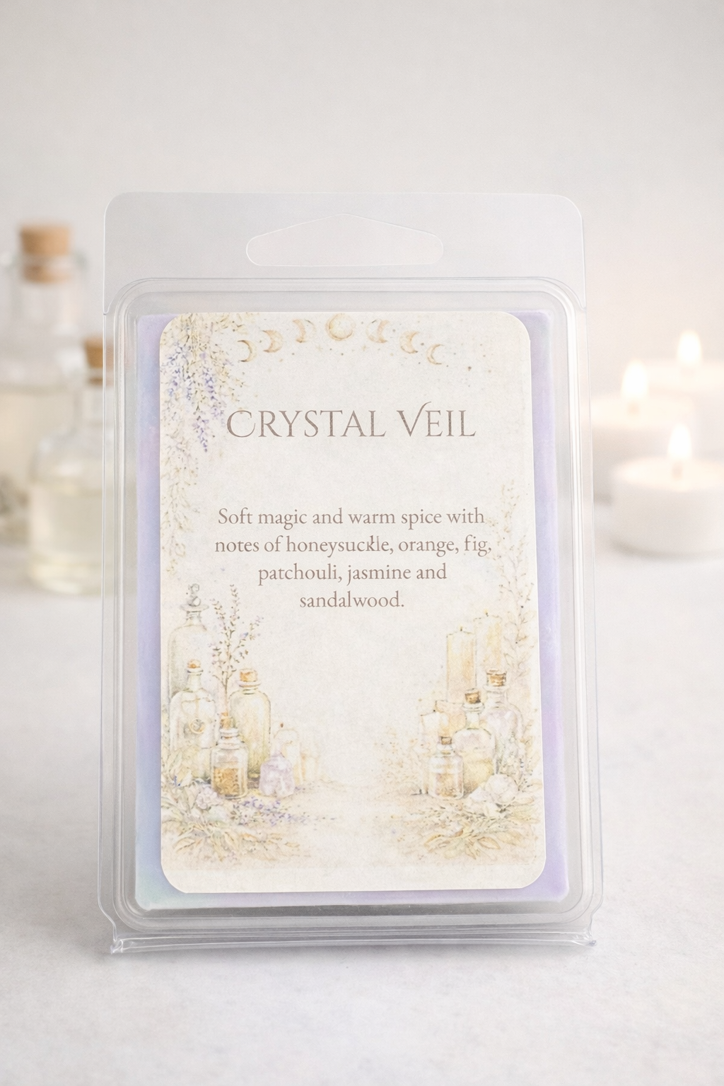 Crystal Veil is infused with a soft and smoky with patchouli, fig, orange, honeysuckle, vanilla musk fragrance oil, mica powder, glitter, candle dye and malachite chips.