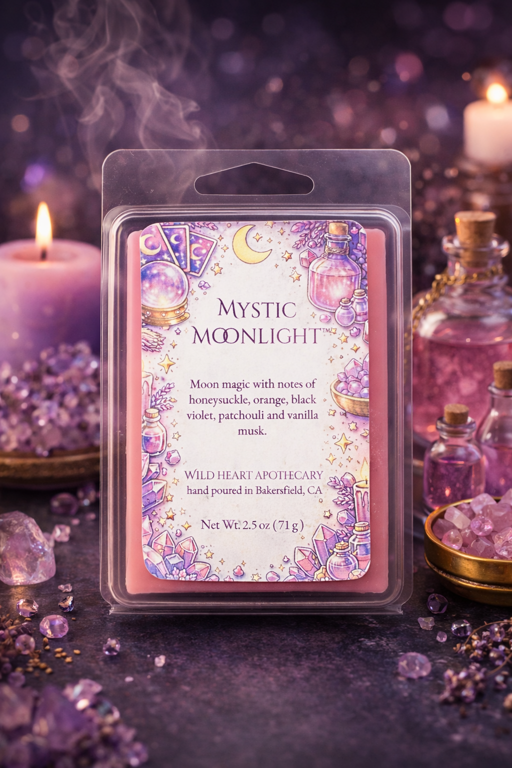 Mystic Moonlight is infused with a fragrance oil that has notes of orange, honeysuckle, black violet, patchouli, sandalwood and vanilla musk, mica powder, glitter, candle dye and rose quartz chips.