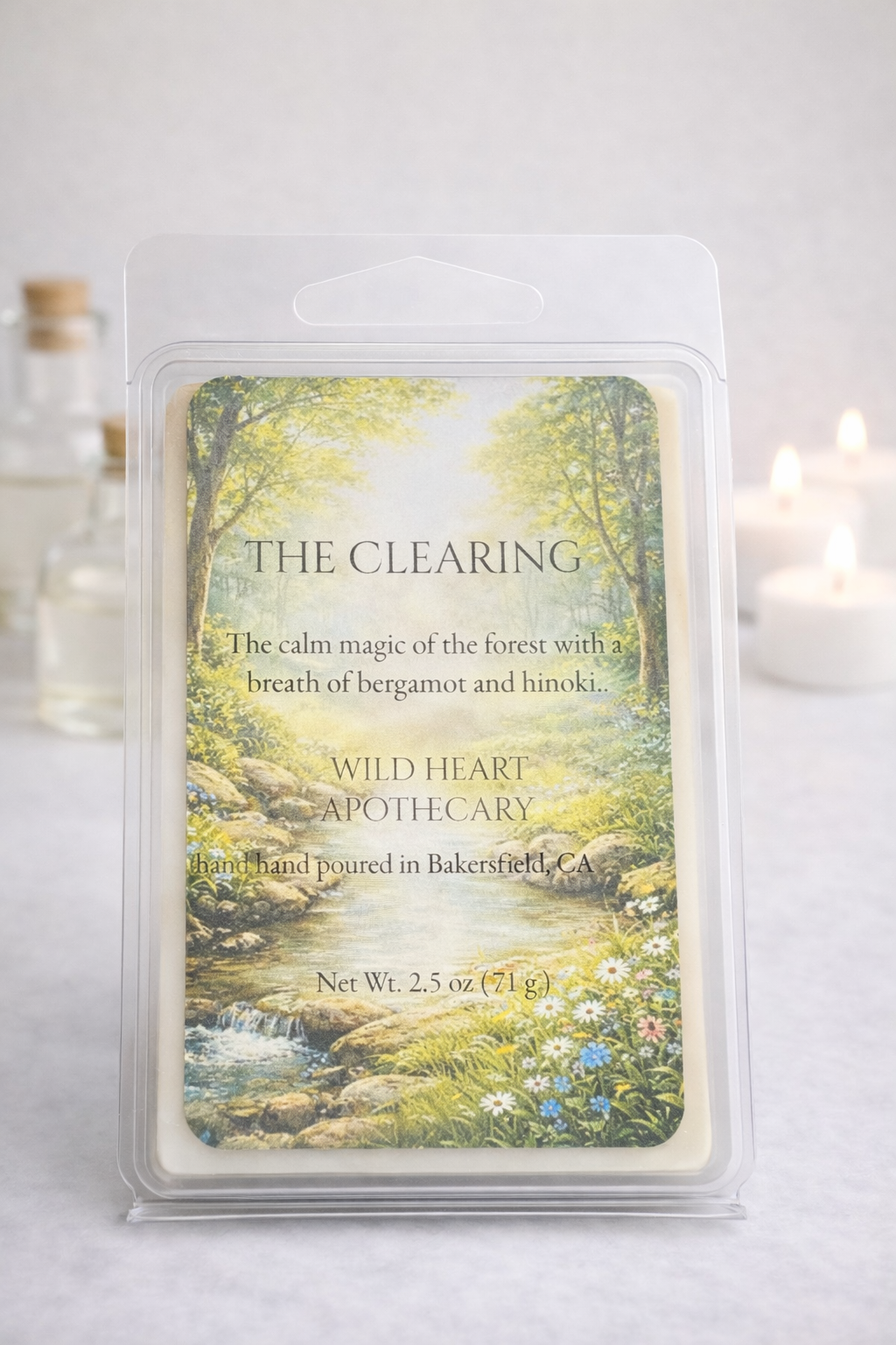 The Clearing is infused with a bergamot and hinoki fragrance oil, mica powder, glitter, candle dye and black tourmaline chips.
