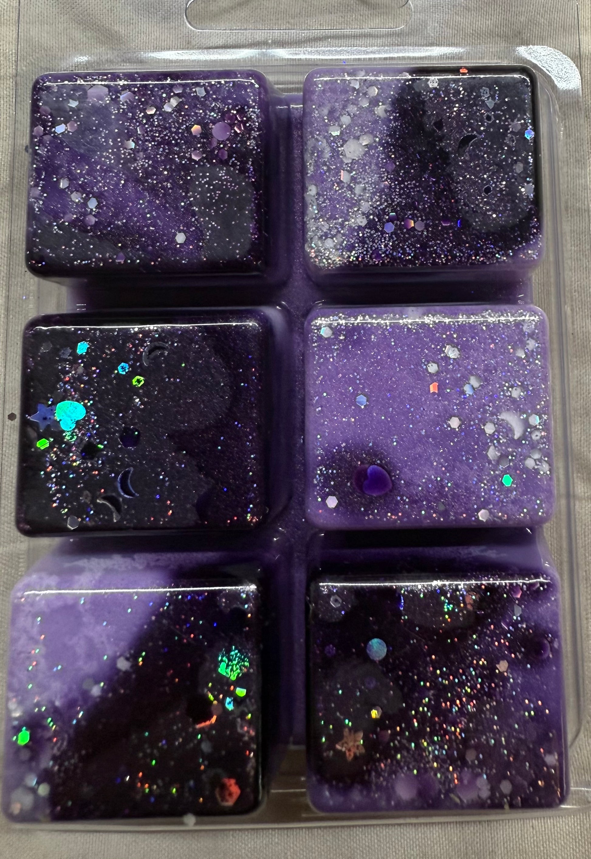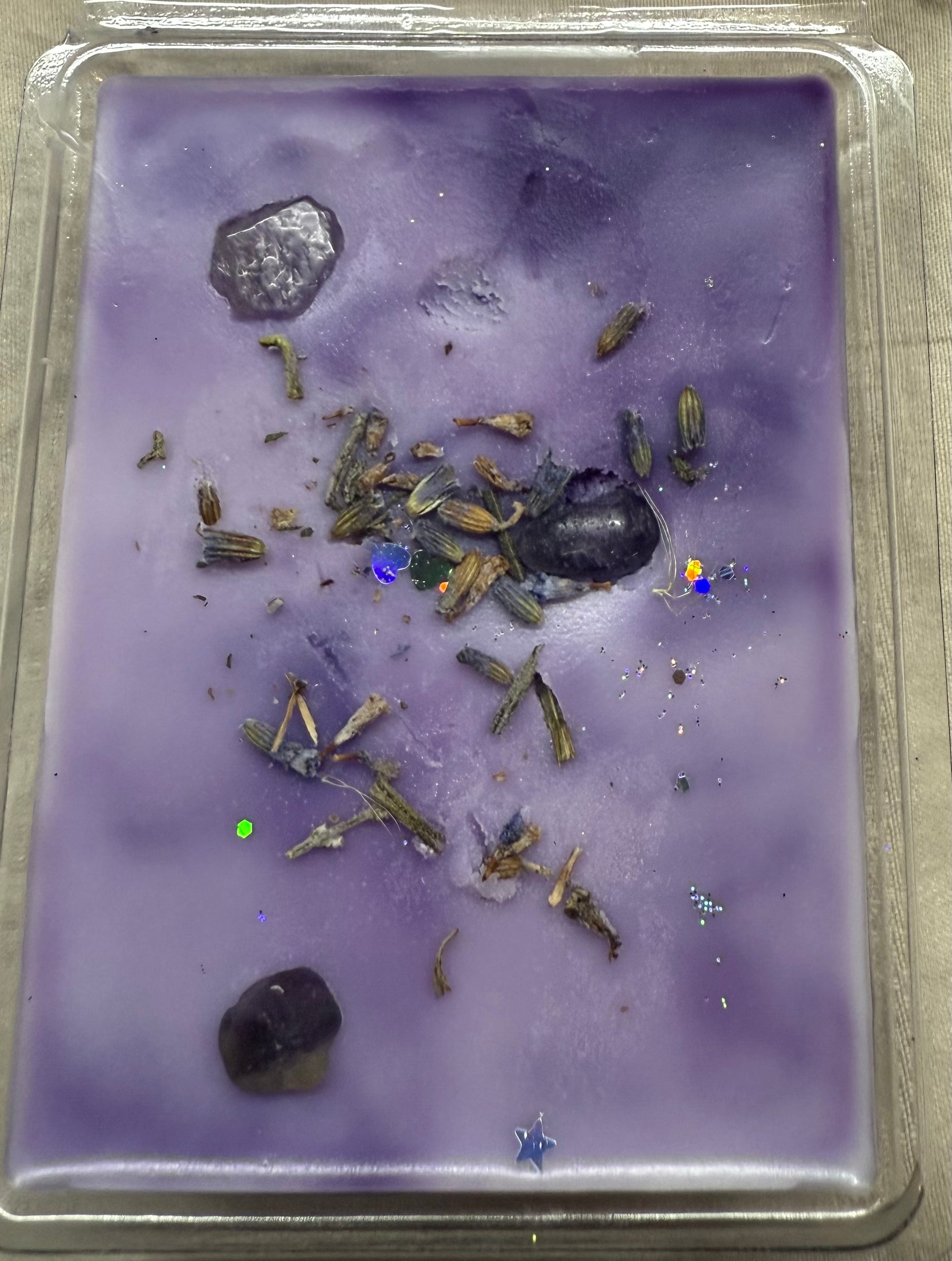 Enchanted is infused with lavender fragrance oil, mica powder, glitter, candle dye and amethyst chips.