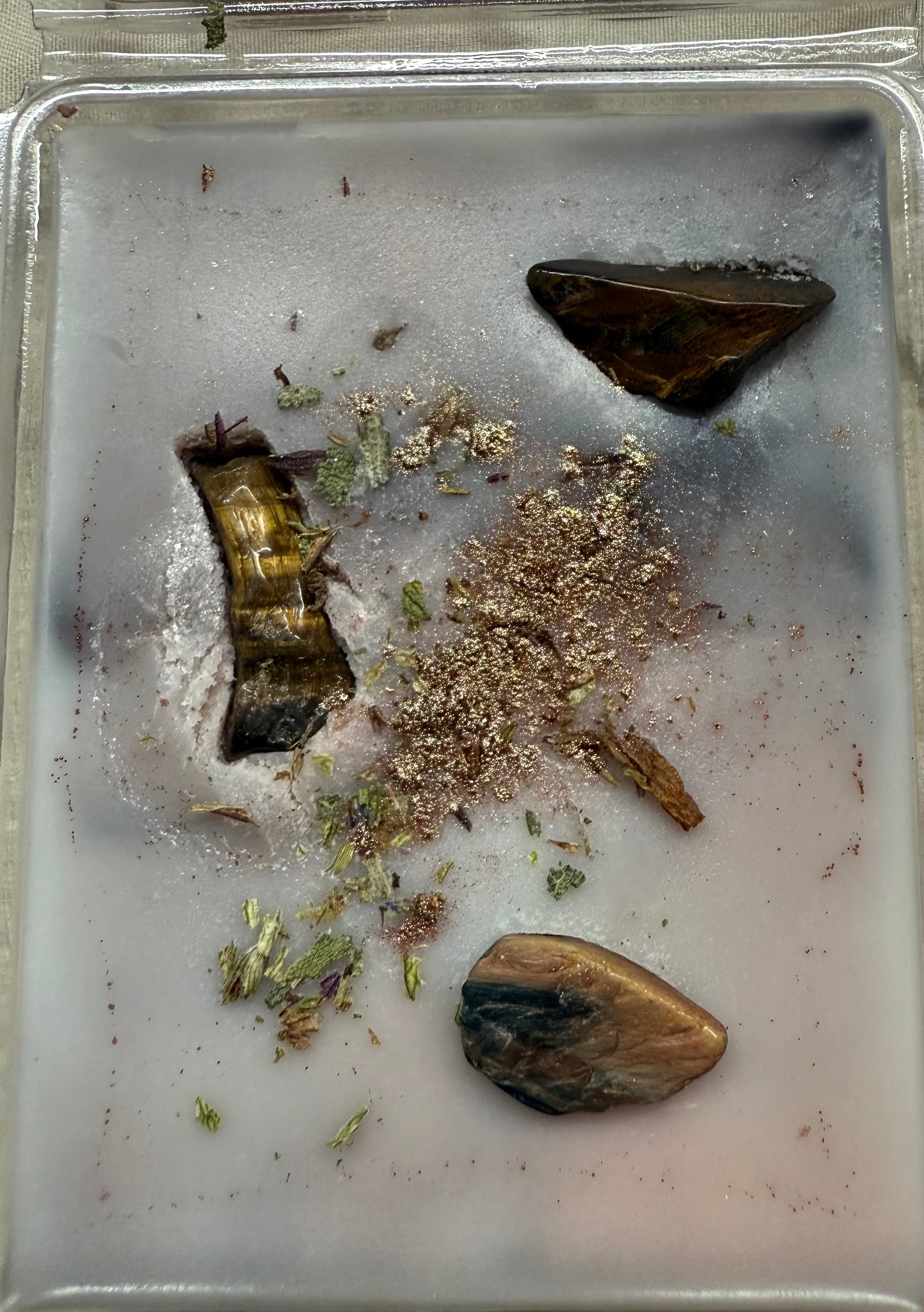 Saged Ash is infused with a rugged blend of smoked saged and ash, mica powder, glitter, candle dye and tiger eye chips.