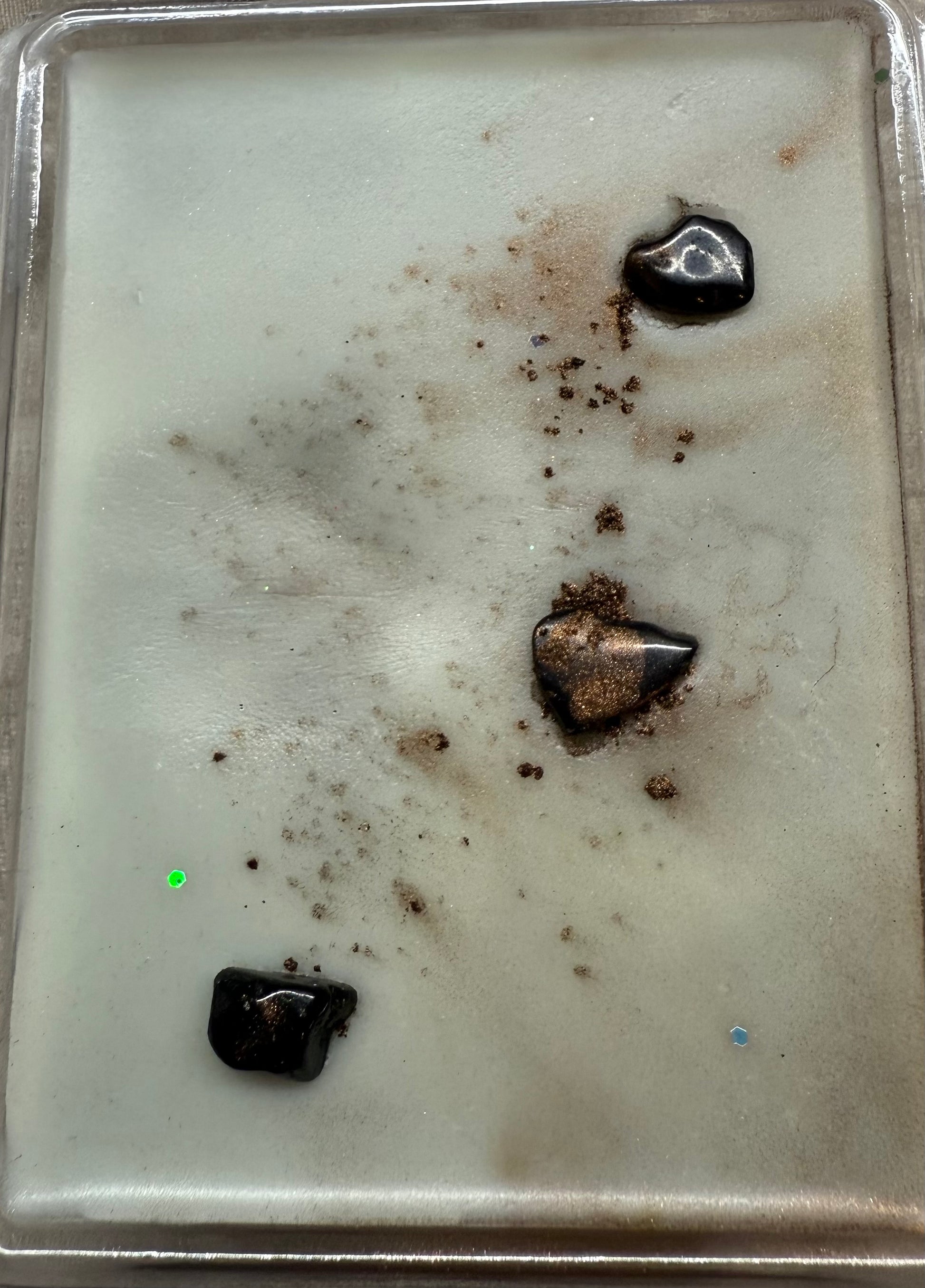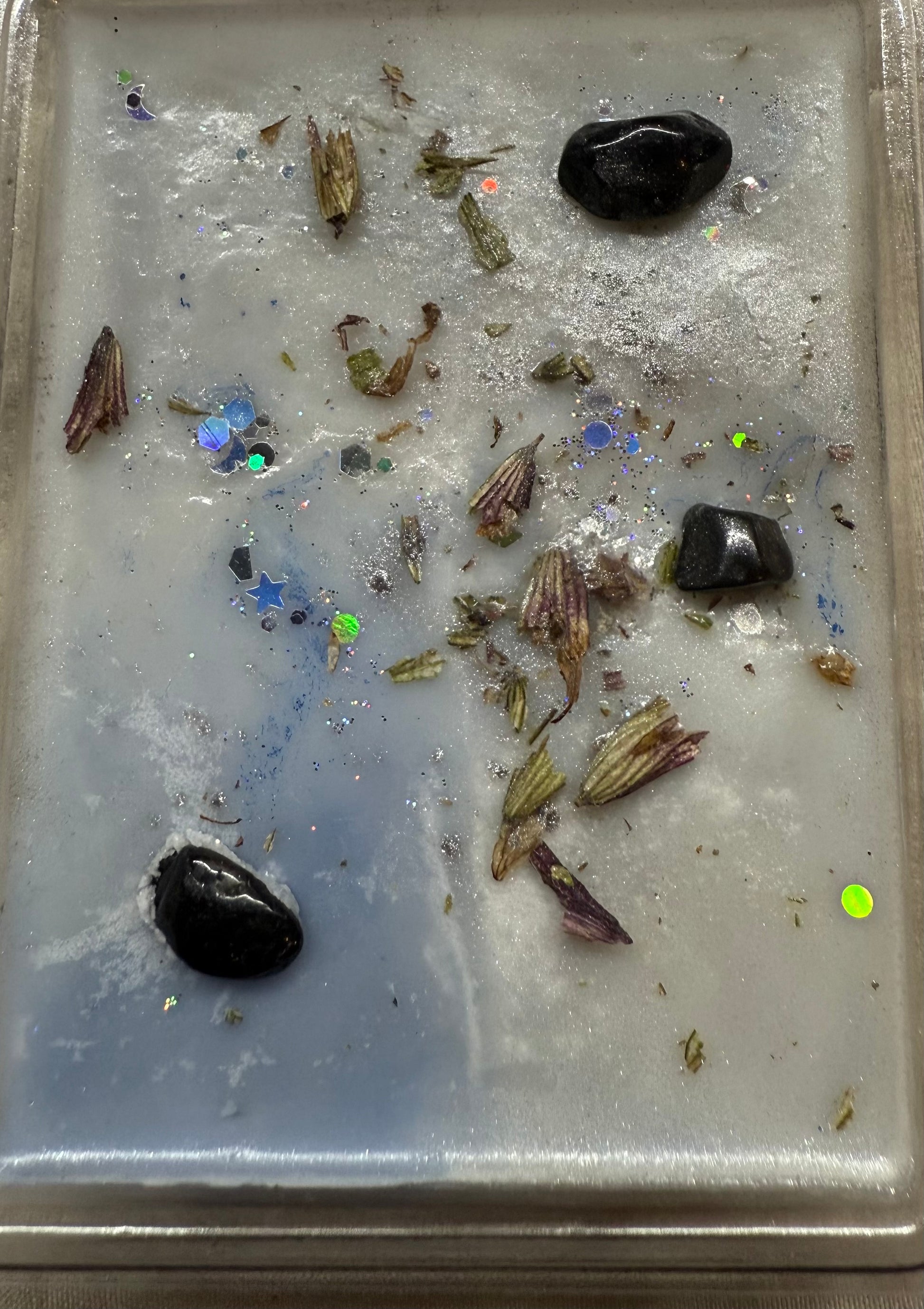 Midnight Rain is infused with an herbal, jasmine and petrichor fragrance oil, mica powder, glitter, candle dye and lapis lazuli chips.