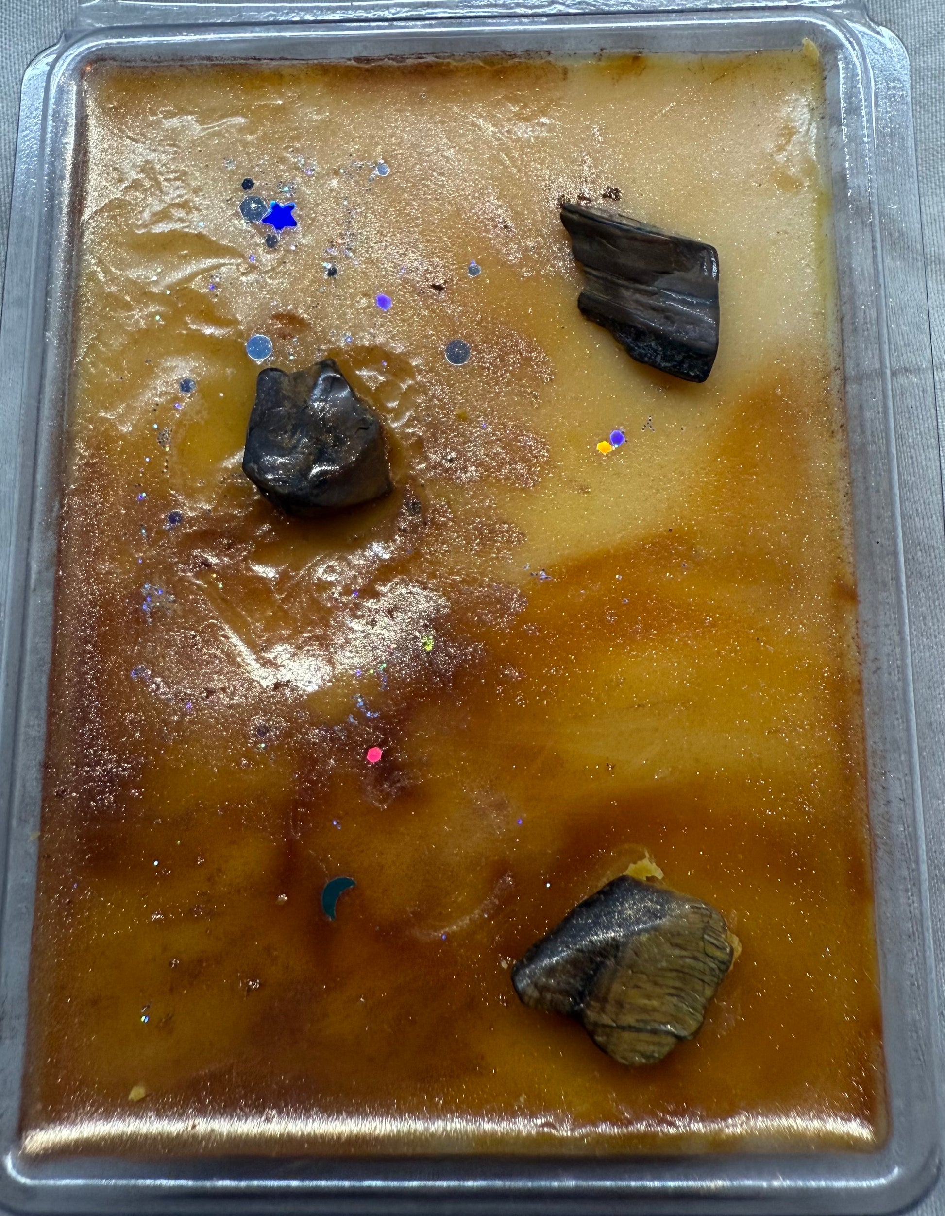 Yuzu You! is infused with a fragrance oil of citrus and the earthy moss of yuzu, mica powder, glitter, candle dye and tiger eye chips.